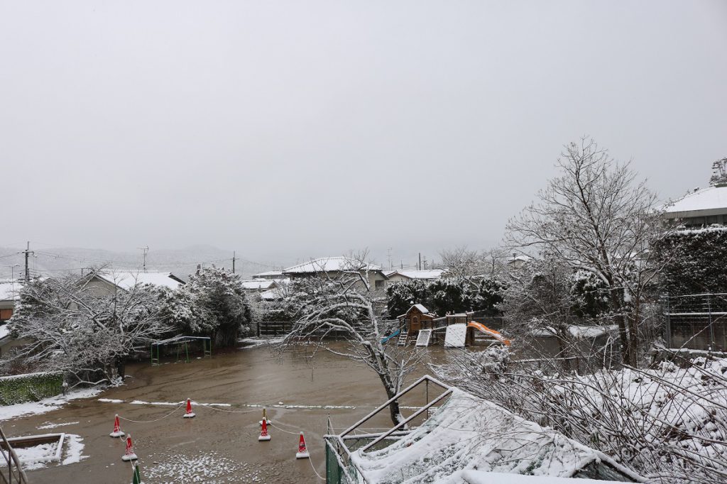 降雪で北の山並みも見えなくなっています