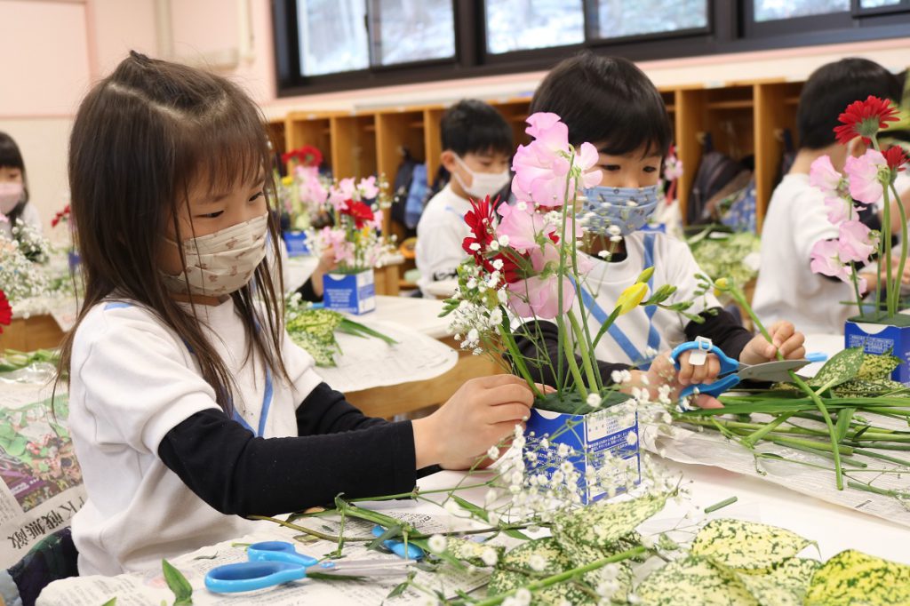 年長すずらん組では今年度最後の華道レッスンの日を迎えました