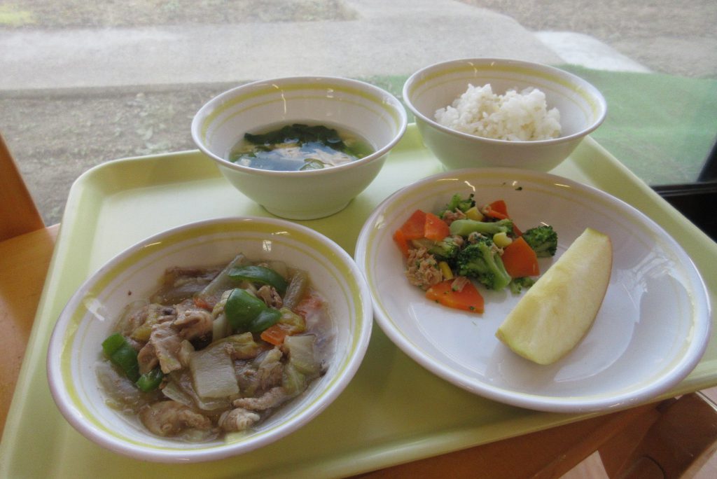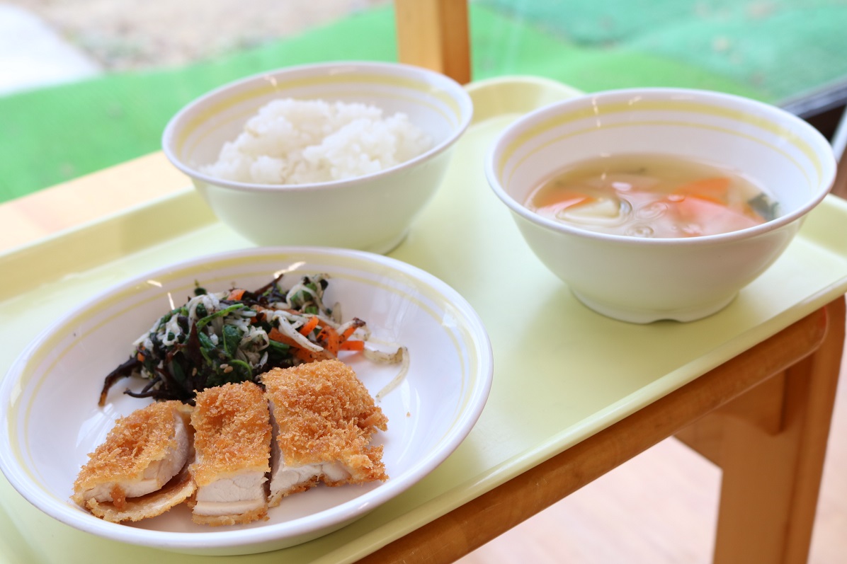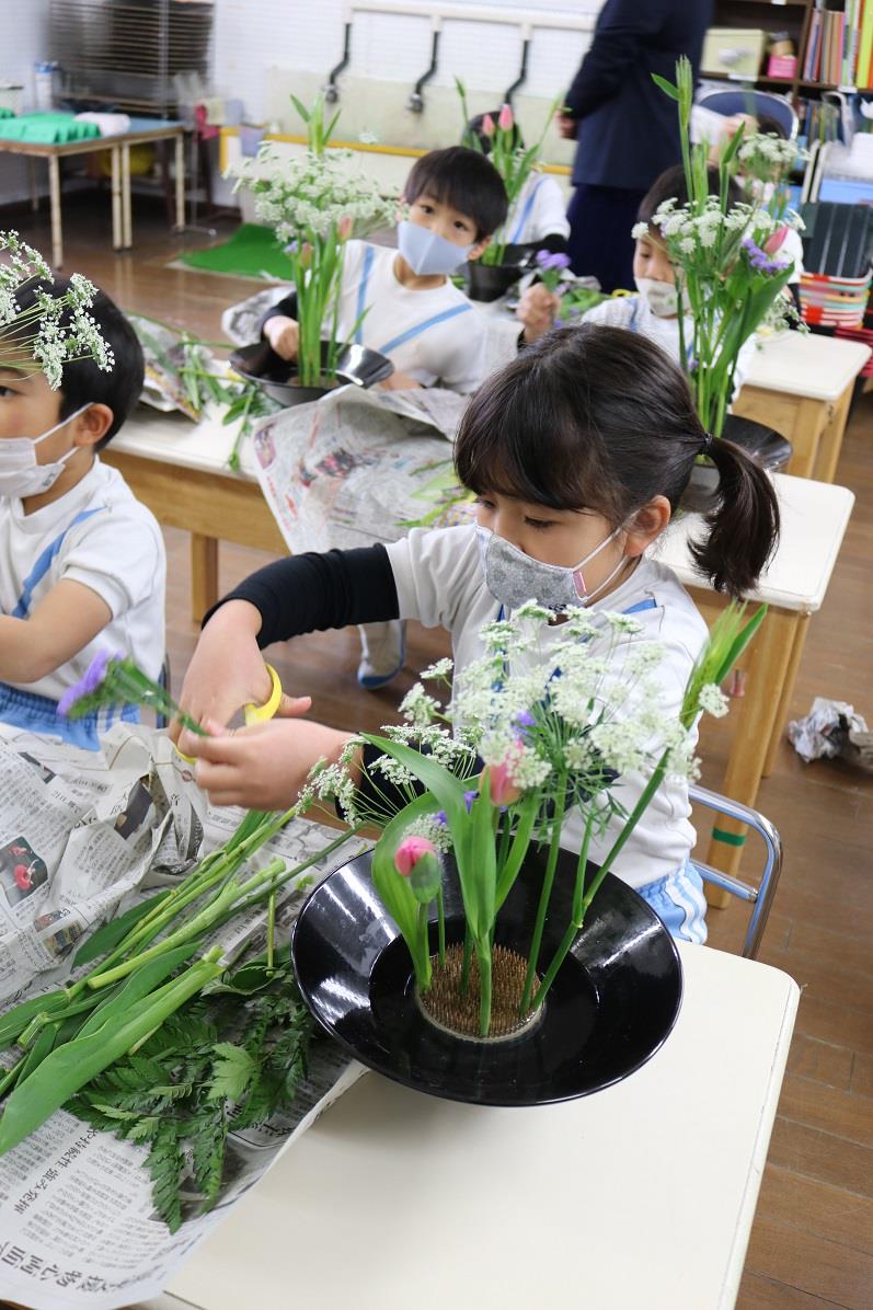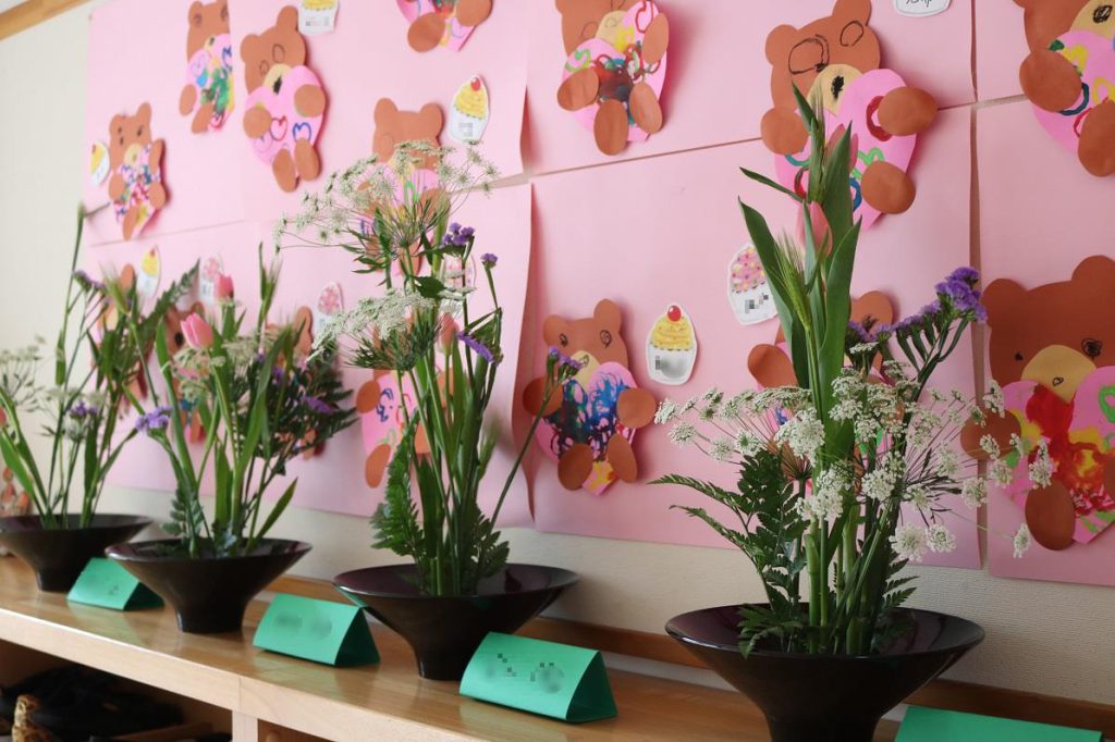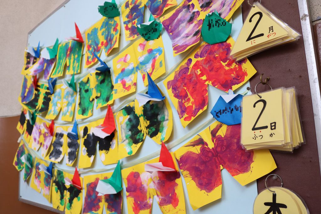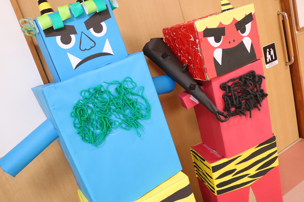 階段踊り場の壁面制作は年少組による鬼のパンツです