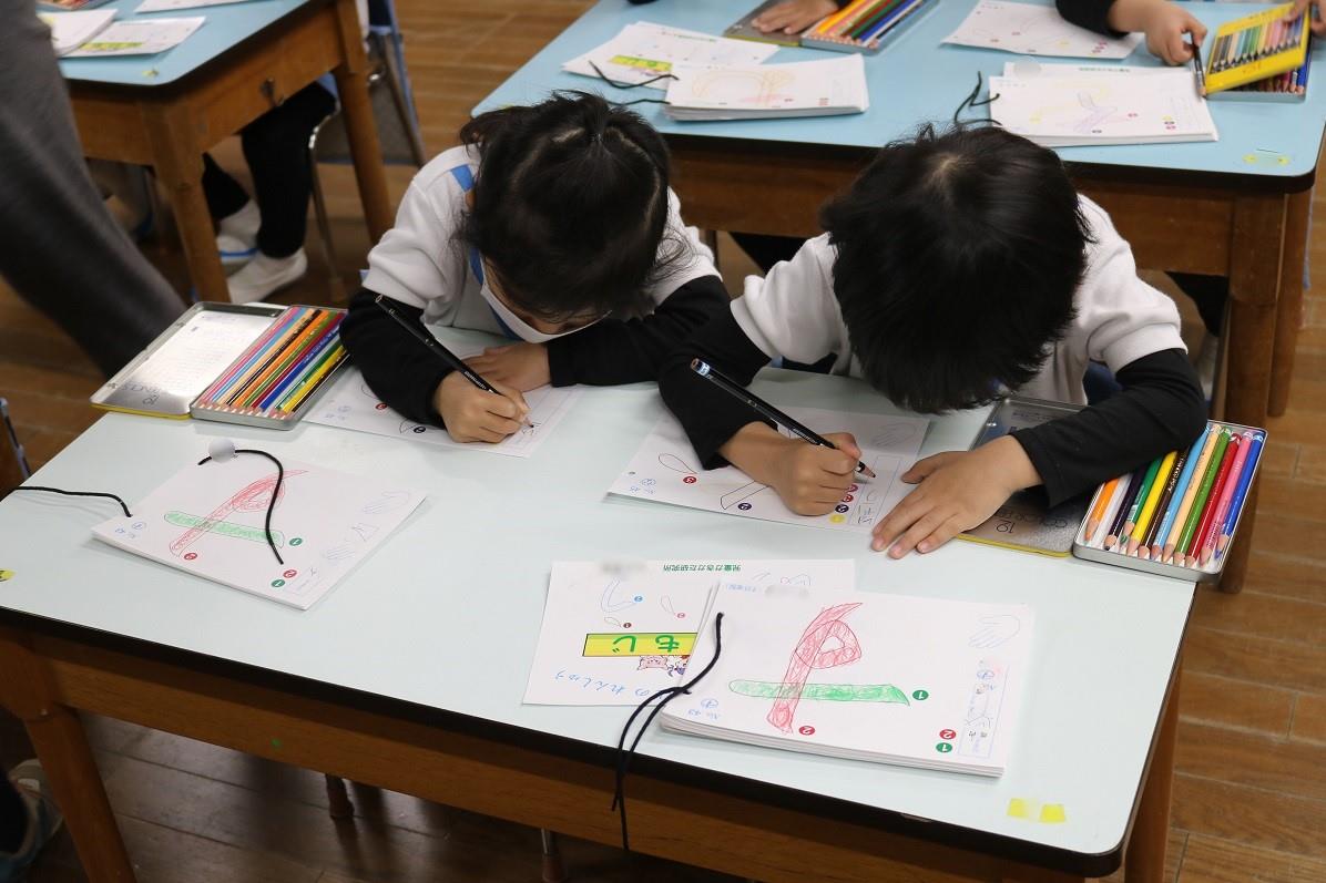 年少もも組がぬりもじに取り組んでいます