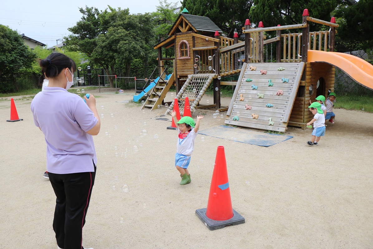 この後みんな集まってきて大喜びでシャボン玉をつかみに行っていました