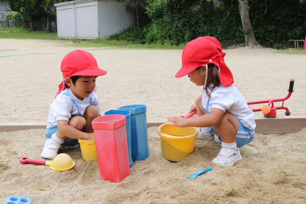 砂場では大きな筒に順番に砂を入れてはのぞき