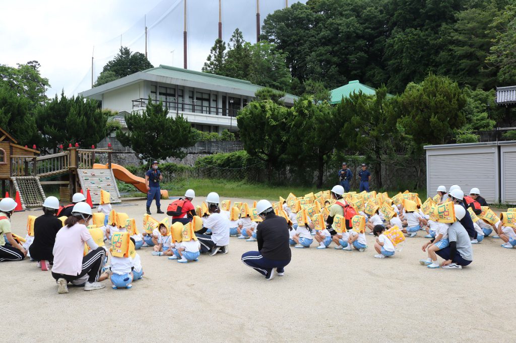 まずは消防士さんが見守るなかでの避難訓練