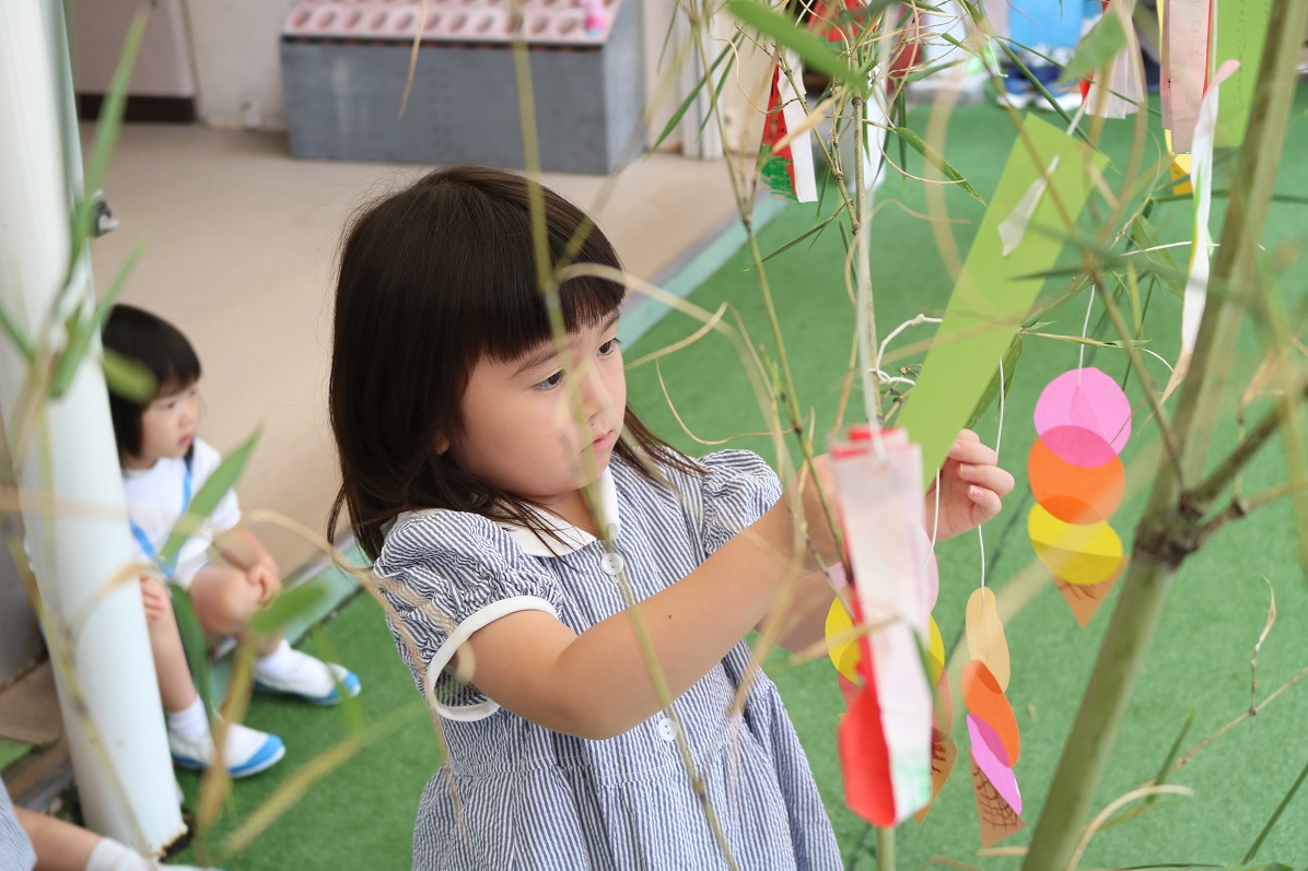 七夕飾り2023.7.3(月) 今年も、毎年ご厚意でいただいている立派な笹が園に届きました 早速年少さくら組の子どもたちが 願い事を書いた短冊を笹に飾りました 全ての学年が飾り終えたら 玄関などに設置しますので 登降園の際にぜひご覧ください