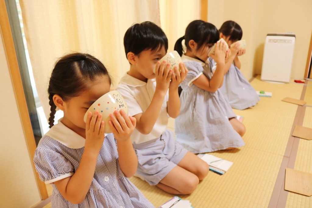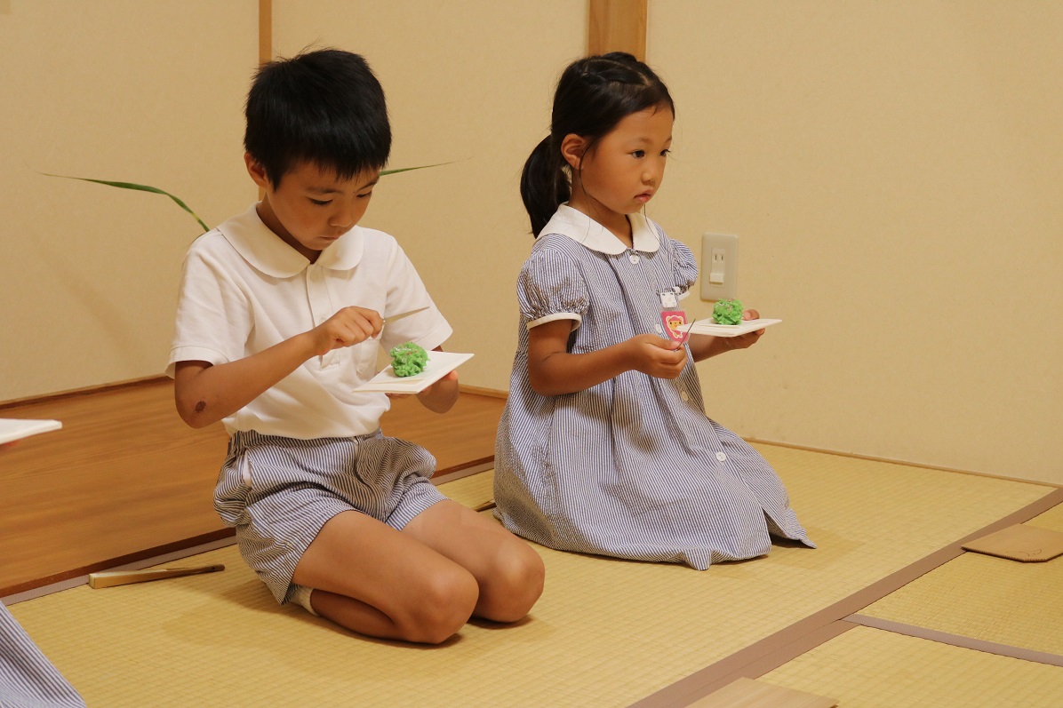 茶道レッスン2023.9.4(月) 年長なでしこ組の茶道レッスンの様子 2ヶ月ぶりのレッスンということで 少しお作法を忘れぎみのみんな😅 今日のお菓子は秋の花「萩」をモチーフにしたきんとんでした 「おいしい」「あんこにがてーー!」と好みもさまざま そしていよいよお茶がでてきました 「にがい!」「おいしい!」こちらもさまざま ひとりの園児が「にがいけどおいしい!」 と上手くまとめてくれました☺