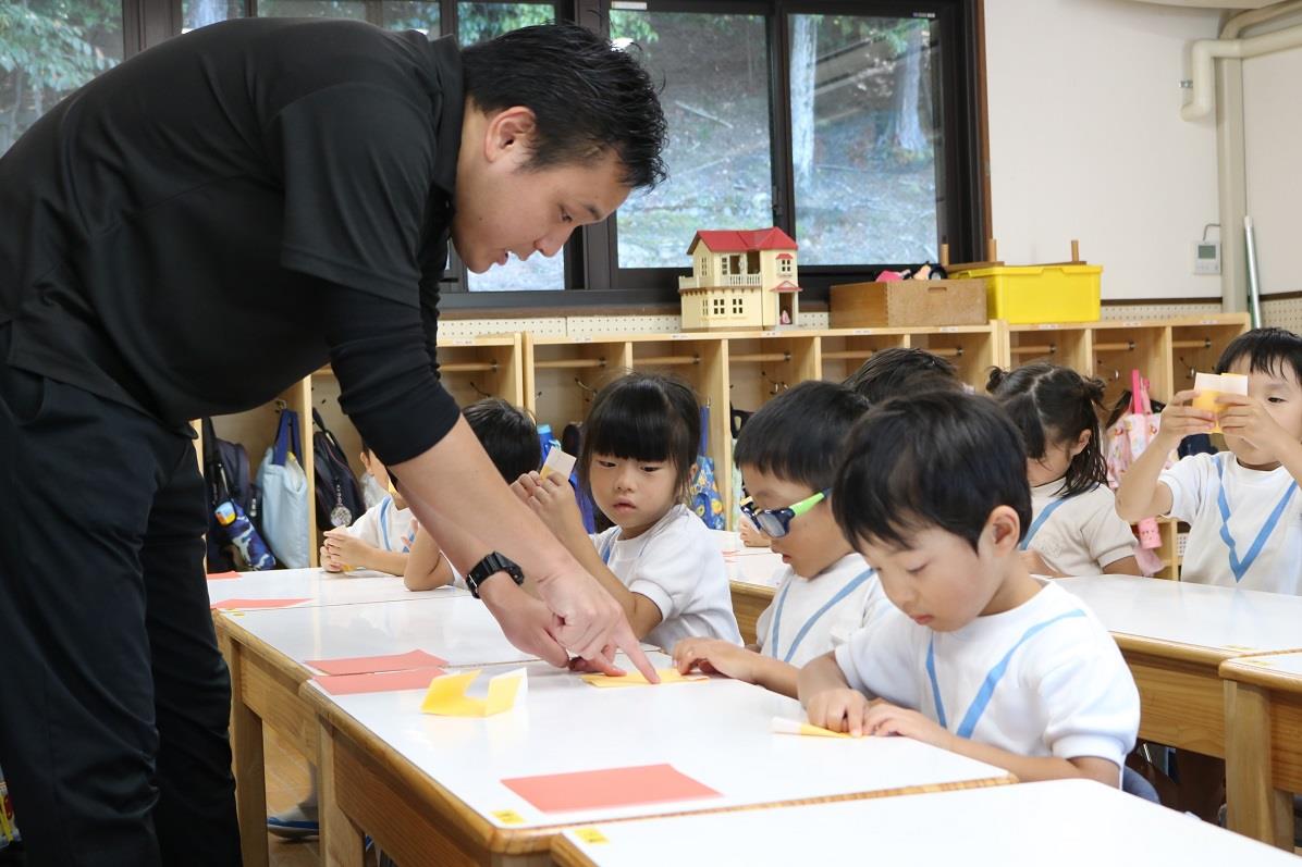 まずは折り紙で秋の風物詩のキノコやドングリを作ります
