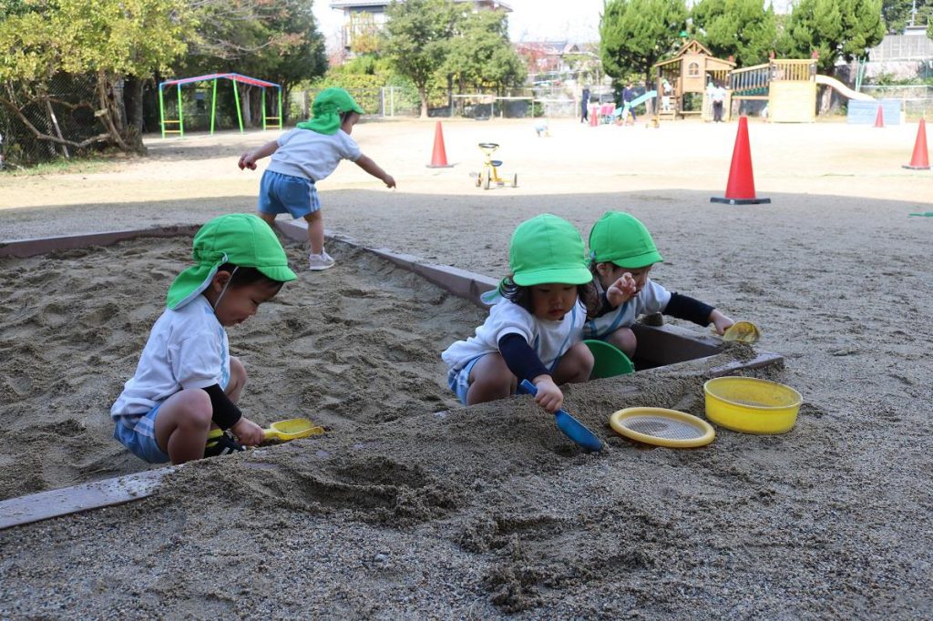 日陰の寒さもお構いなしに砂場で穴を掘る園児