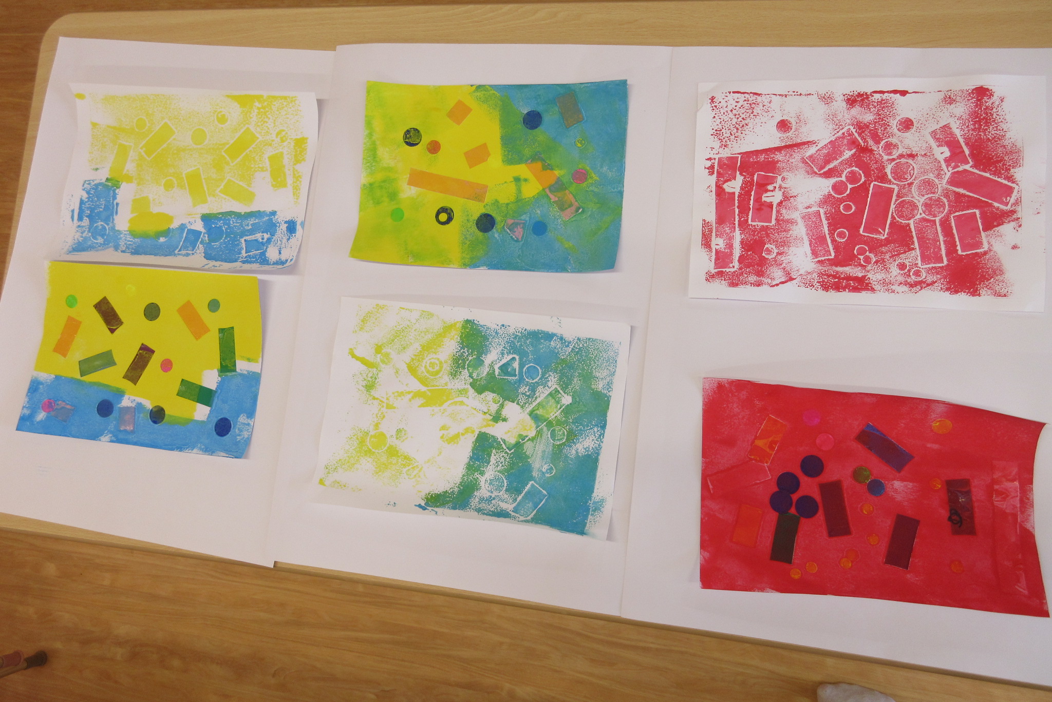 シールを紙にたくさん貼り、その上から好きな色の絵の具をつけローラーでコロコロ、、、