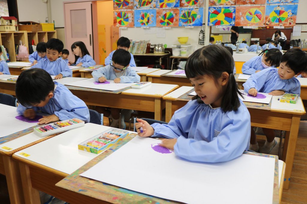 クレパスに絵の具を重ねていき仕上げていきます