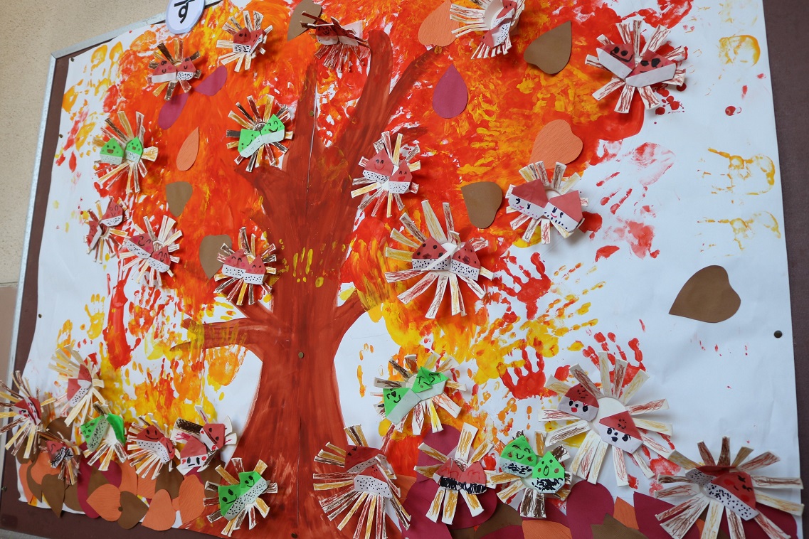 階段壁面の年中組による素敵な紅葉とかわいい栗たちも