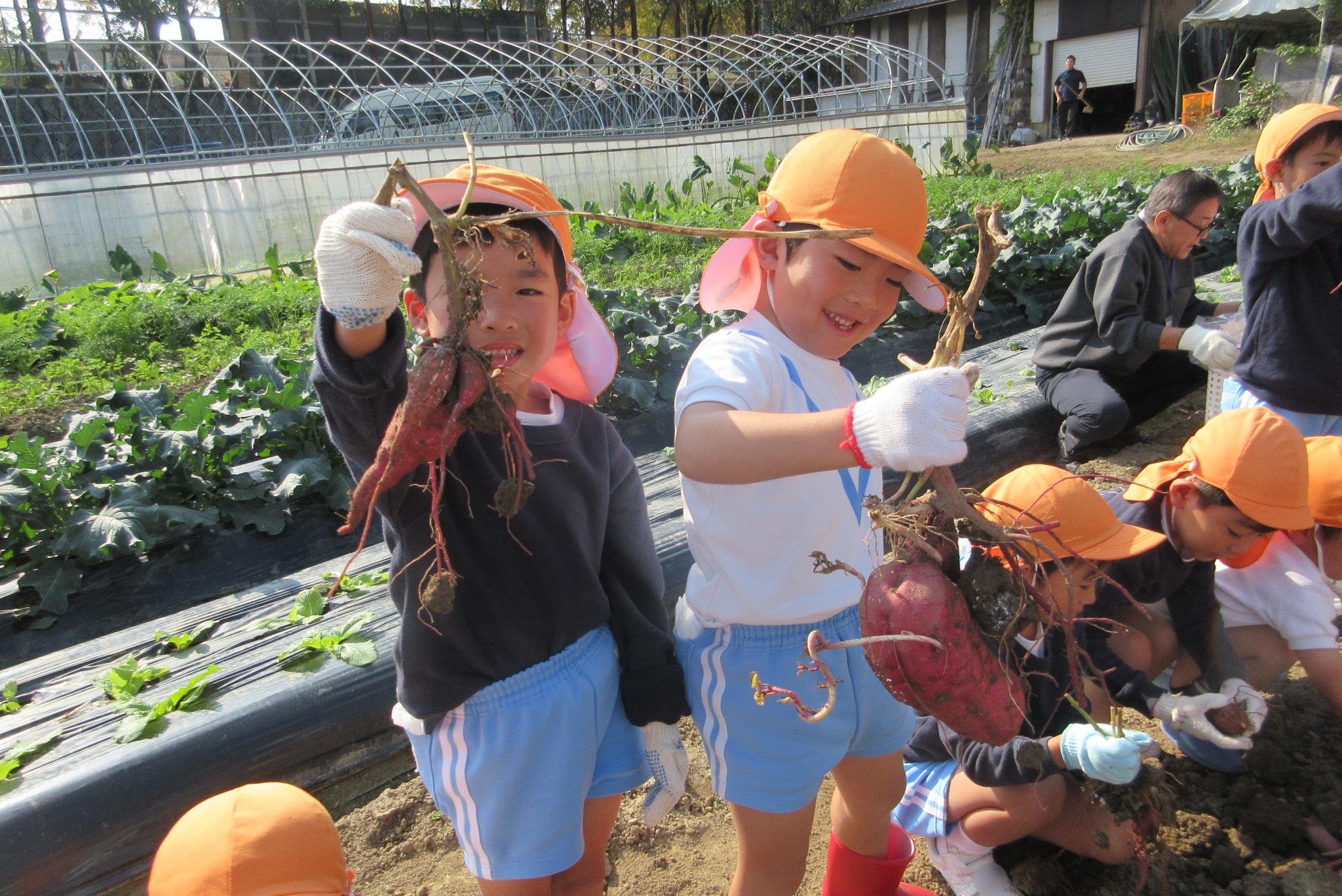 自分の掘ったお芋をお友だちと見せ合って「おいしそうなおいも!」「おっきすぎるー!」と大喜び