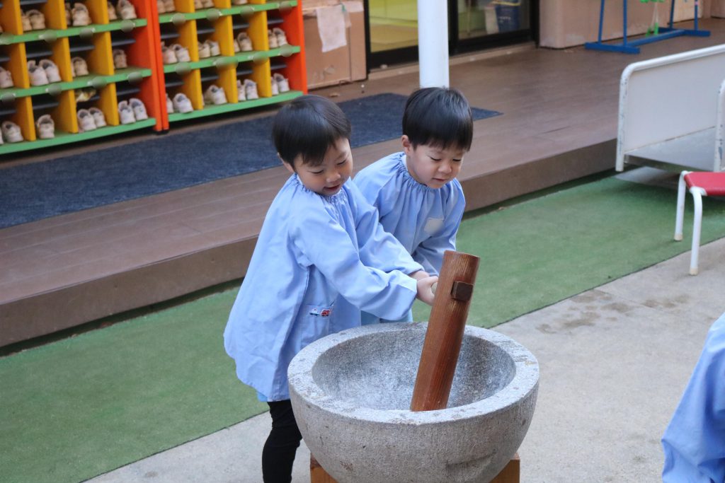 2歳児以上の園児全員が順番に杵を持っておもちをつきました
