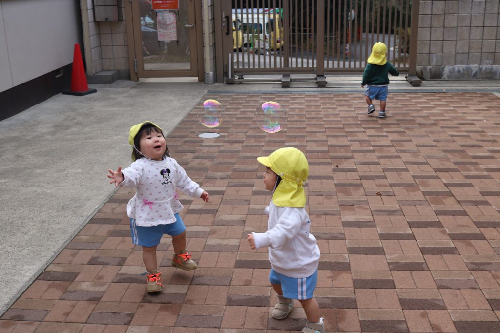 冬本番2024.1.23(火) 二十四節気では「大寒(だいかん)」と呼ばれ その名の通り、冬が最も厳しくなる時期です 天気予報でも今季最強寒波が到来するとのことで 外の空気もキンキンに冷えてきています とは言え寒がっているのは大人だけ 子どもたちは寒さをものともせず戸外遊びを楽しみます 大きなシャボン玉をどんどん追いかけるのは0歳児ひよこ組さん 体も温まってきたね!
