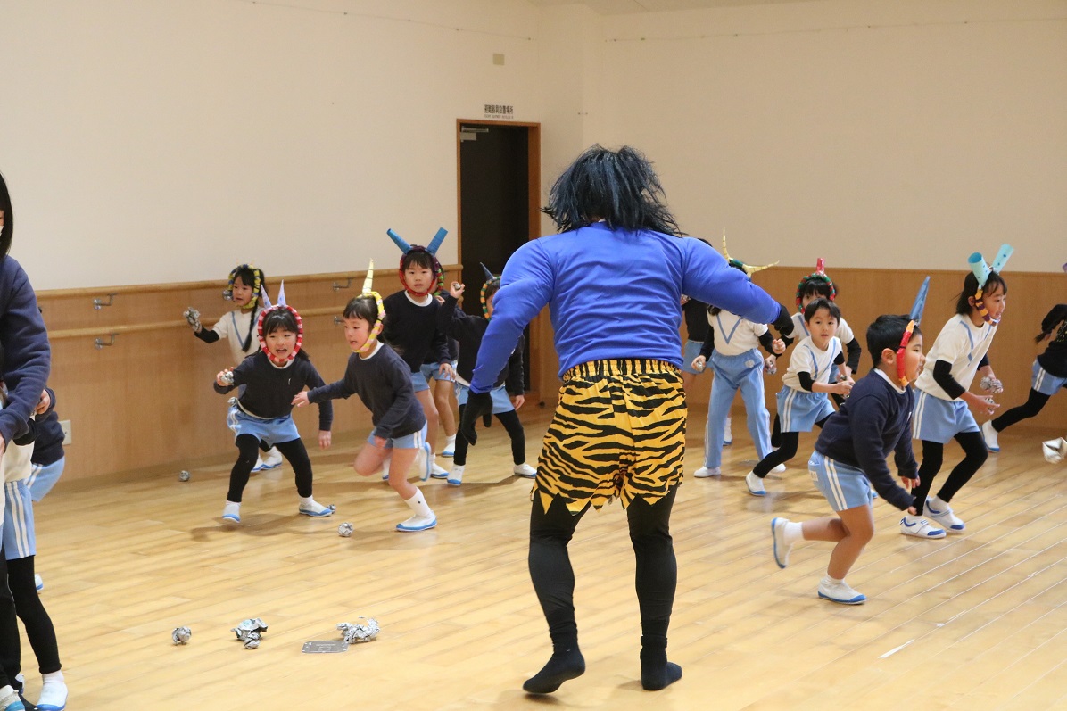遊戯室で豆まきのお話を聞いていると・・・
