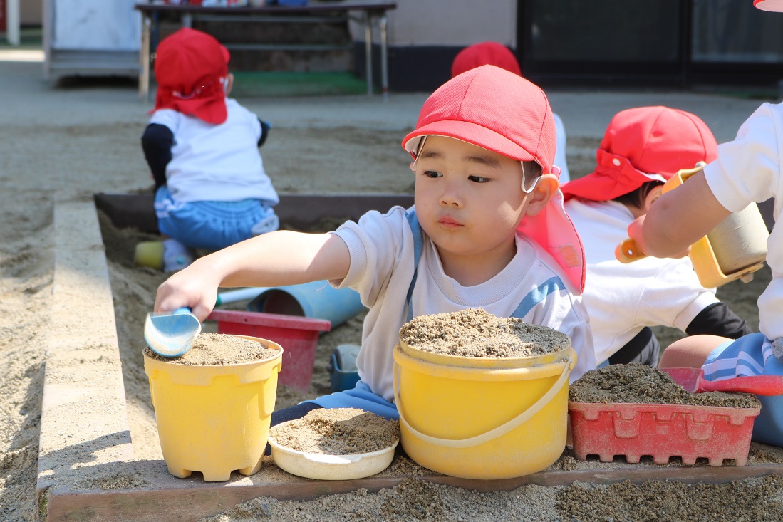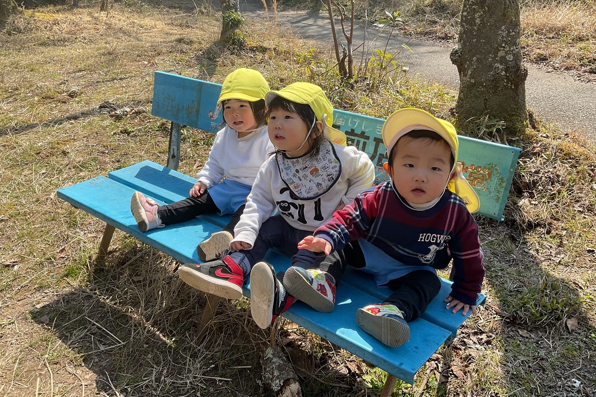2歳児こぐま組のみんなは園庭にシートを広げて