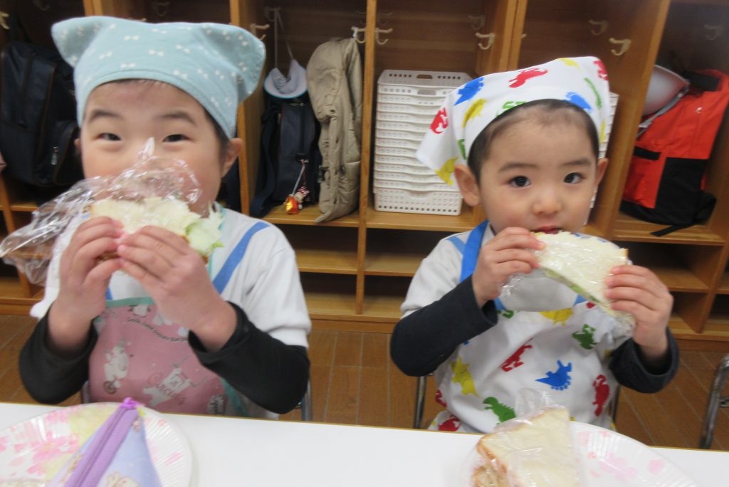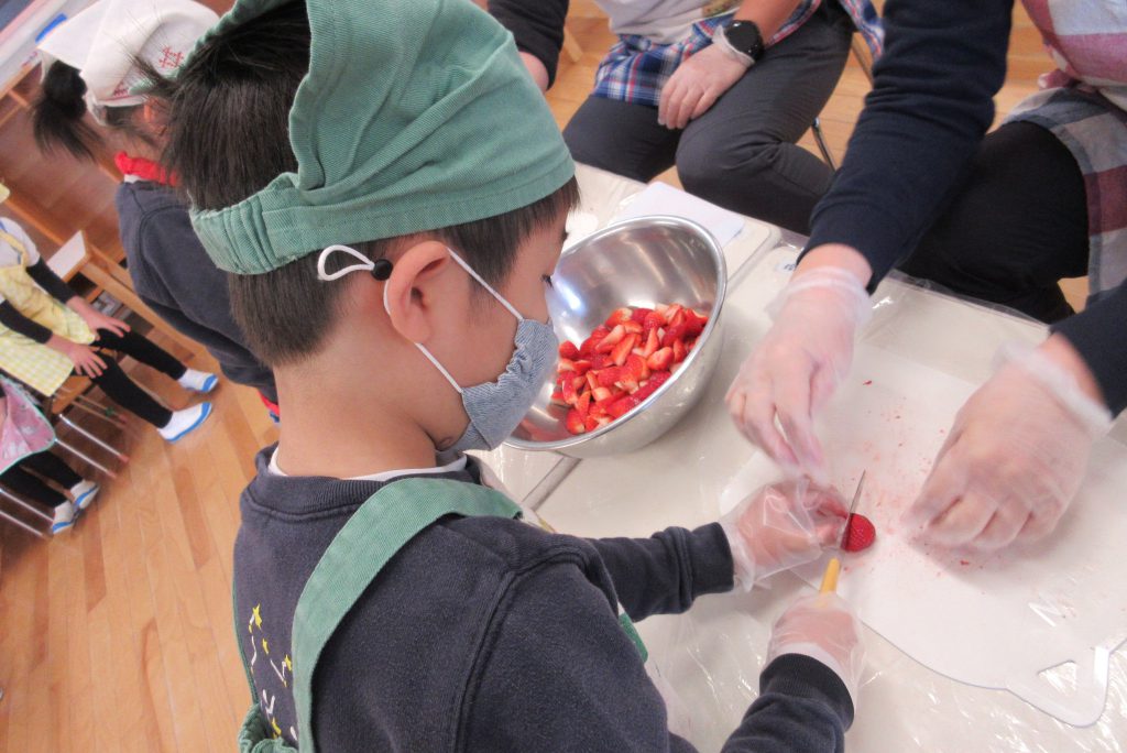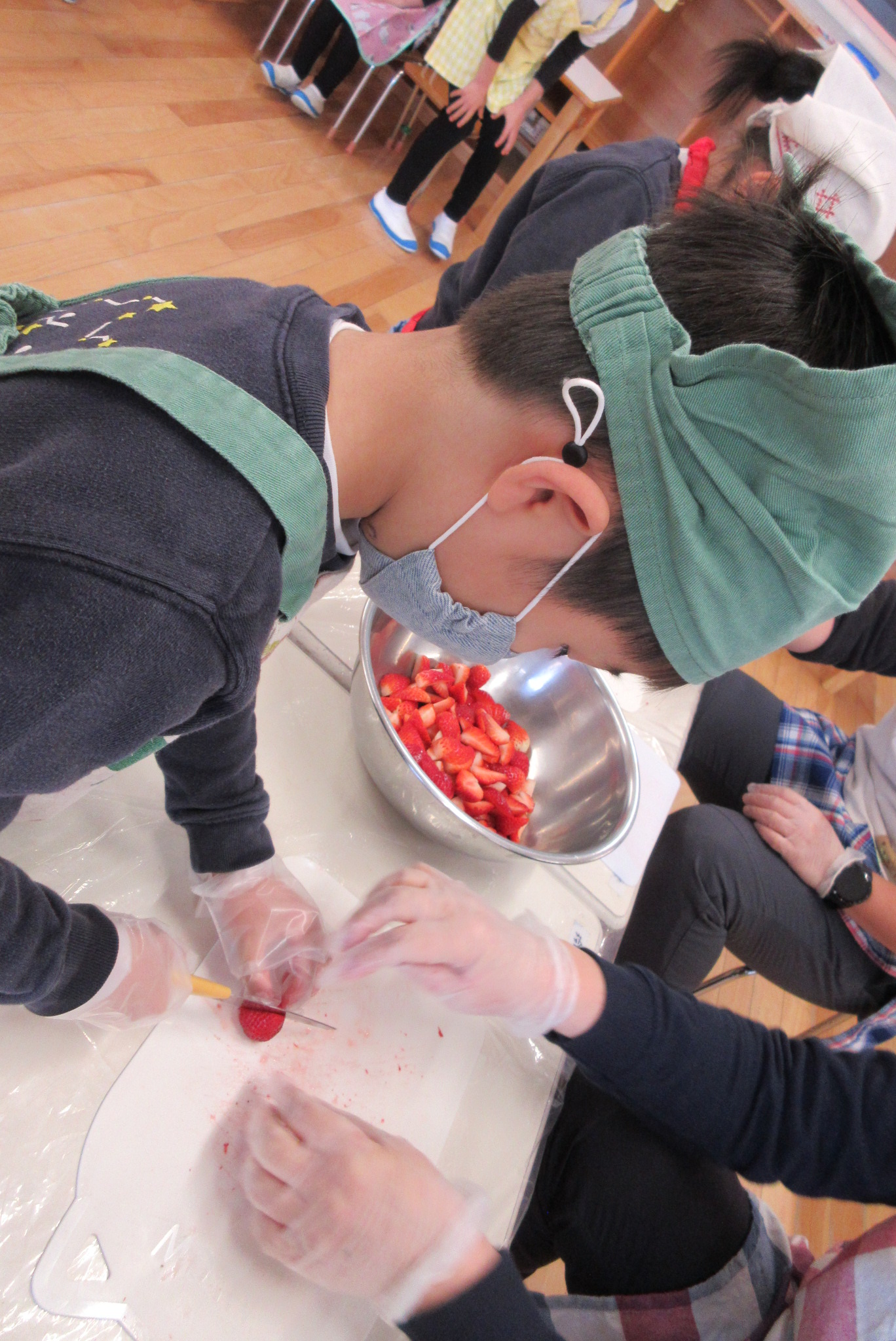 それぞれ学年に分かれて、食パン・バナナ・イチゴを切ってもらいました