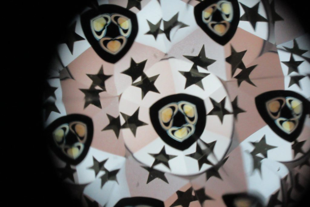万華鏡本体の周りに、子どもたちがデザインしたイラストを貼ったり