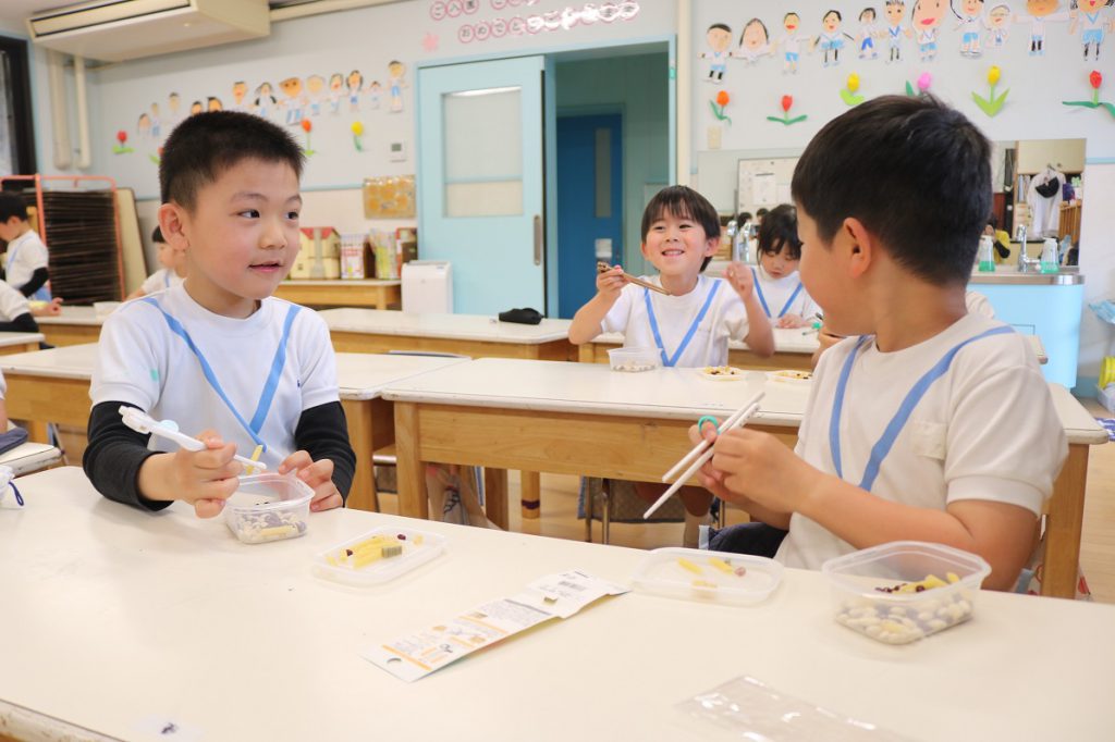 年長なでしこ組では豆つかみをしていました