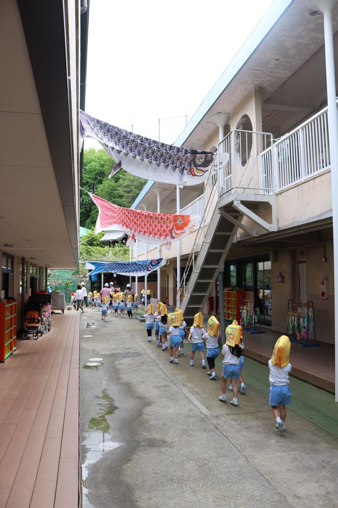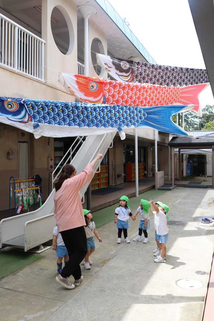 端午の節句が近づき、園のお空にもこいのぼりが泳いでいます!