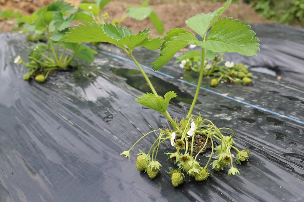 園の畑のイチゴの苗が、天からの恵みの雨に潤されて