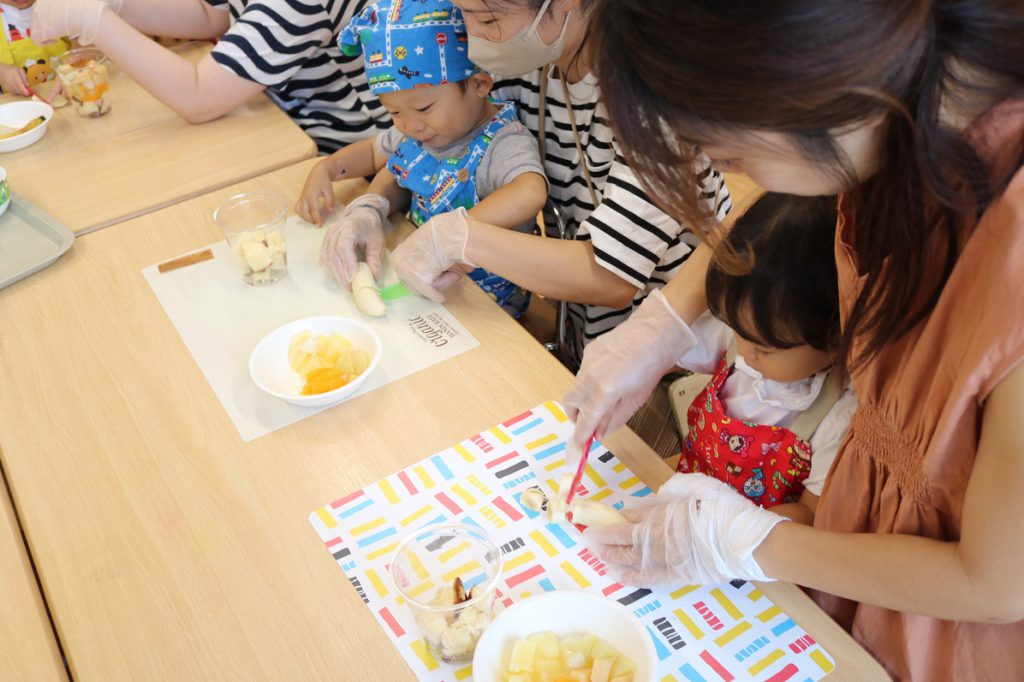 今日の子育て支援は親子でフルーツパフェづくりに挑戦