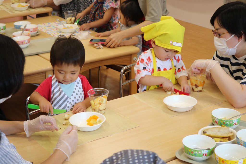 バナナの皮をむいてプラスティックのナイフで小さくカットをしたり、色々なフルーツを盛り付ける顔は真剣そのもの
