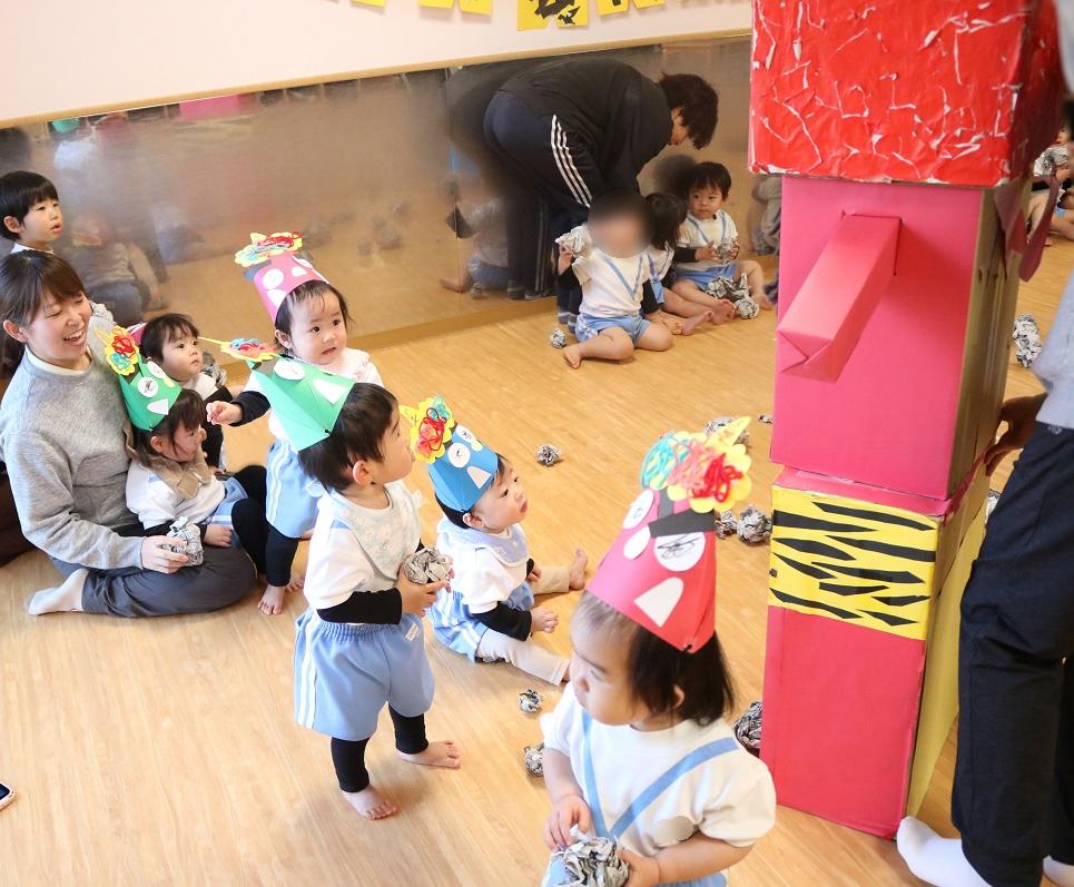 「鬼はぁーーーーそと!!」と鬼をめがけて投げました