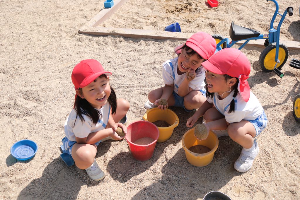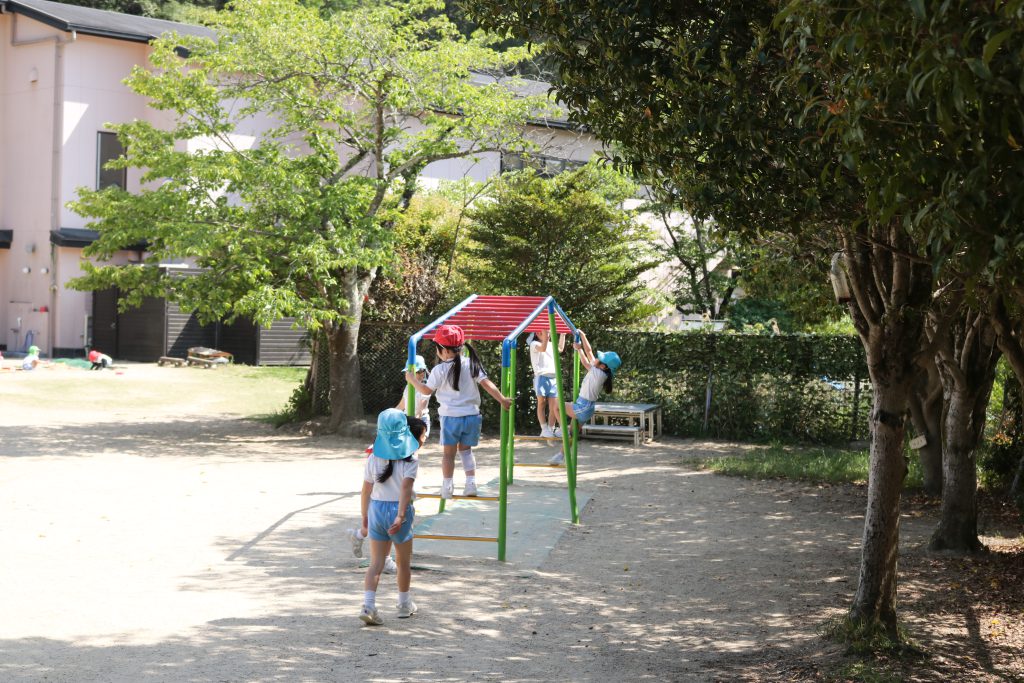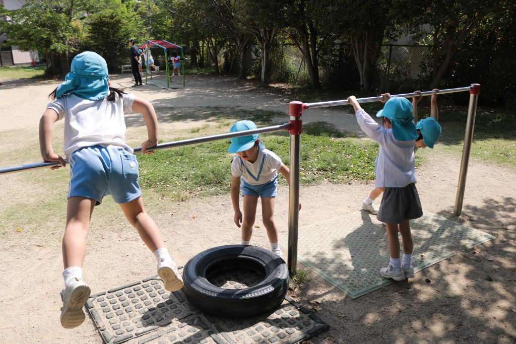 園庭には鉄棒や雲梯で元気いっぱいに遊ぶ子どもたちがいました