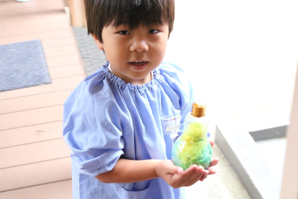 ボトルに綿を入れる時にわり箸を使って丁寧に押し込む年中さん
