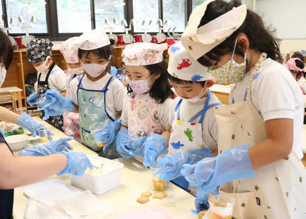 サマースクール5日目2025.8.1(金) サマースクール5日目はクッキング! クッキーの型抜きとパフェ作りに挑戦しました フルーツやアイスクリーム、クッキーをトッピングして完成!! 自分で作ったパフェに大満足の子ども達でした