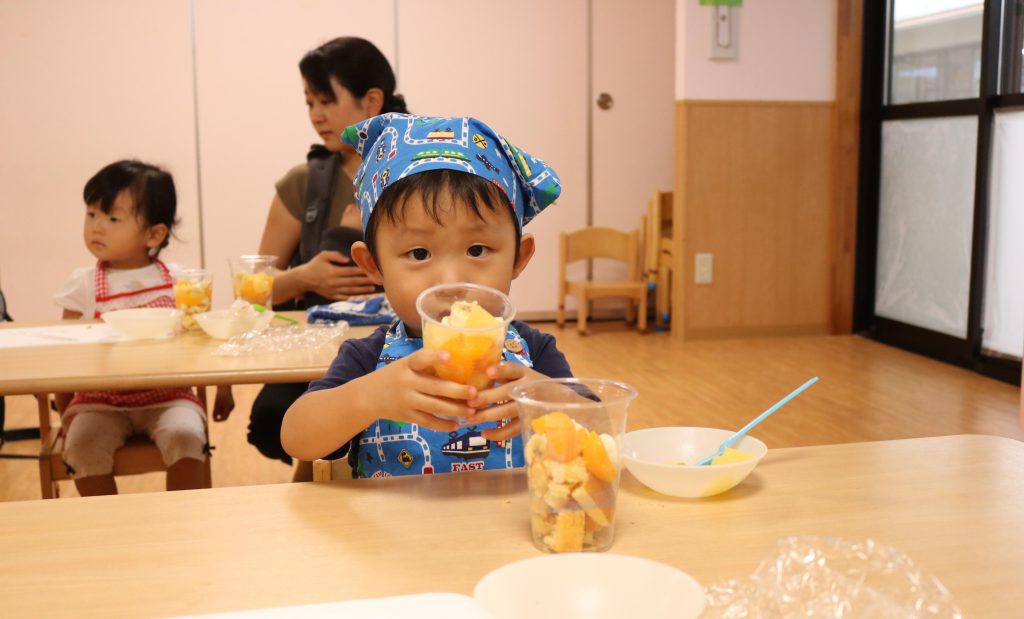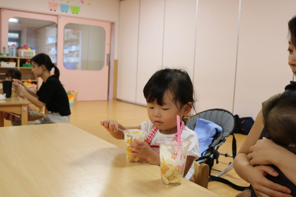 あそびにおいでよ!2025.10.8(水) 今日の子育て支援「あそびにおいでよ!」では フルーツパフェ作りを楽しみました🍊 お母さんと一緒にフルーツやアイスなどをお好みで盛りつけ おいしそうなパフェが出来上がりました