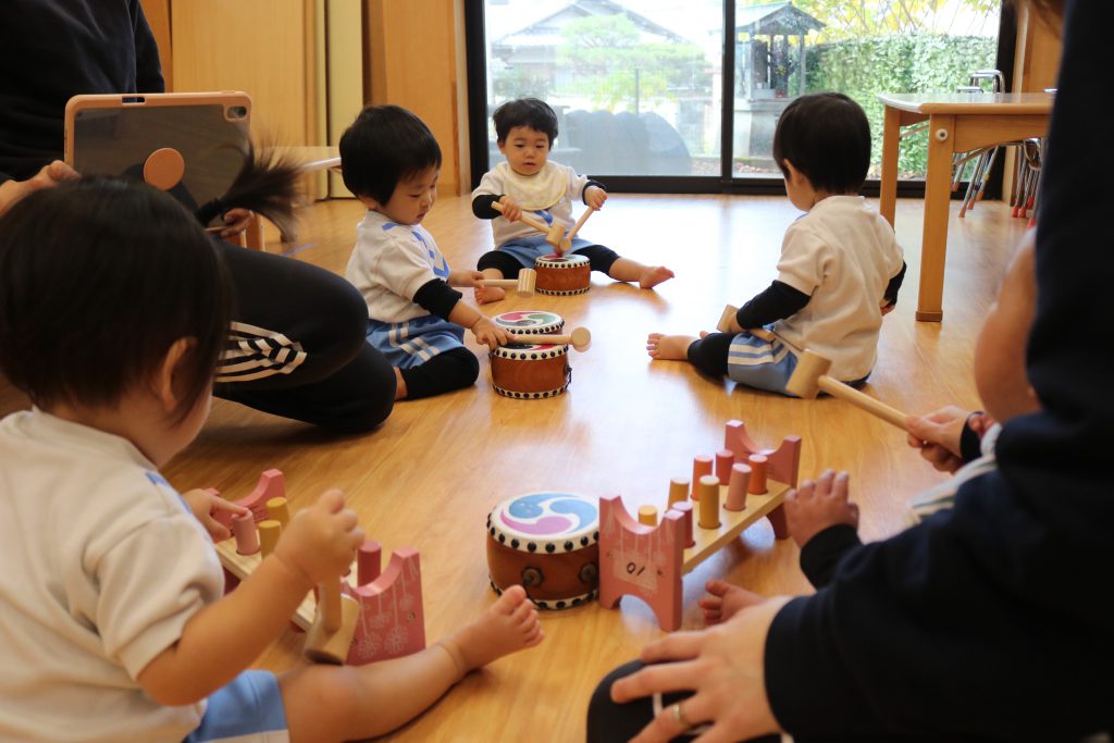 とんかち型のバチを持ってトントンと音を鳴らす遊びです