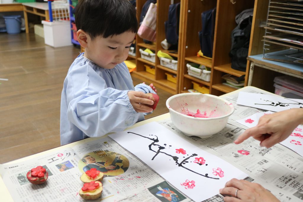 芋版(先生作)で作った梅の花をポンポンとスタンプ!!
